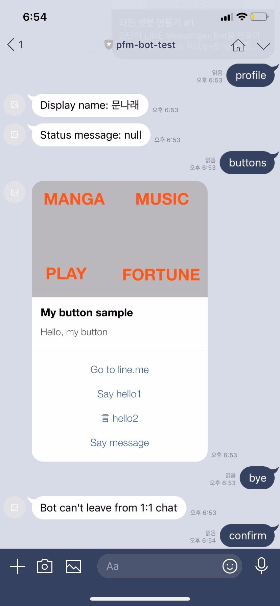친구로 등록한 챗봇과 대화창을 열고, sample-spring-boot-kitchensink에 있는 controller에서 등록된 메시지(ex : profile, buttons, bye,...)를 입력하면 샘플봇이 지정한 event에 대해 맞게 챗봇이 응답을 만들어 줍니다.