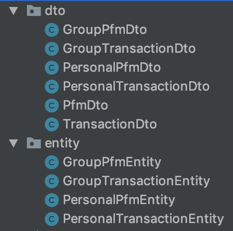하지만 개인 가계부와 그룹 가계부를 명확하게 분리해야겠다는 생각이 들어 PfmEntity를 PersonalPfmEntity, GroupPfmEntity로, TransactionEntity는 PersonalTransactionEntity, GroupTransactionEntity로 분리하였습니다.