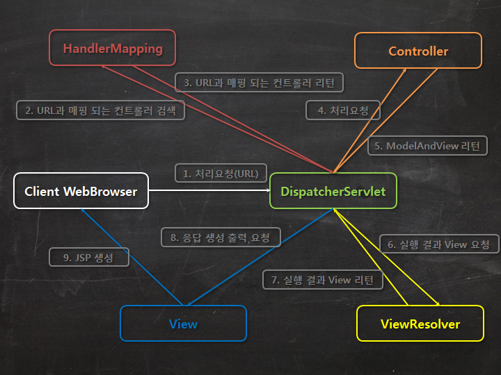 클라이언트에게 요청(url)이 들어오면, DispatcherServlet은 요청을 가로채어, HandlerMapping에게 URL과 매핑되는 컨트롤러를 받아옵니다. 그리고 Controller는 해당 URL이 해야 할 기능을 수행하여 결과를 리턴합니다.