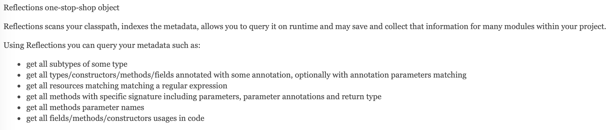 아래는 Reflections 클래스에 대한 Java Reference입니다. 한 번에 제 프로젝트에 있는 많은 모듈들의 정보를 가져올 수 있다고 합니다.