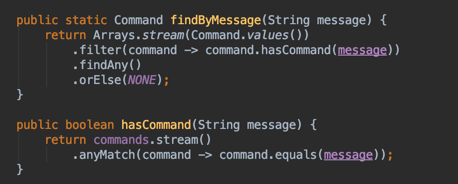 위와 같은 명령어 비교 대신 enum을 좀 더 잘 쓰기 위해, enum 내부에 다음과 같이 message에 해당하는 Command를 찾아 반환하는 메소드를 작성했습니다.