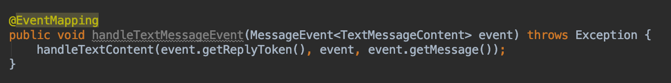 LINE Messaging API에는 @LineMessageHandler라는 어노테이션이 있어, 해당 어노테이션을 붙인 클래스에서 채팅방에서 일어나는 Event에 대해 다음과 같이 EventMapping을 하여 기능을 수행할 수 있게 합니다. 이렇게 해서 사용자에게 메시지가 들어오는 MessageEvent를 처리할 수 있습니다.