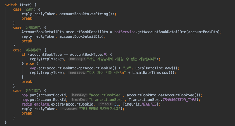 일단 가계부 정보인 accountBookDto와 회원 데이터로 취급하는 개인 가계부 정보인 personalAccountBookDto, 사용자가 입력한 메시지인 String text 자체를 파라미터로 사용하는 메소드가 많기 때문에 if문을 통해 파라미터를 담았습니다.